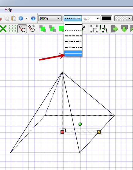 I’m using your gallery image of a rectangular pyramid and working to add details to it. How can I add a dotted line that can serve as an altitude? I can draw the line, but I can’t get the little square sign to hang at the bottom. I’ve tried to draw two short lines to make the square symbol, but it is not working quite right. Do you have any suggestions?