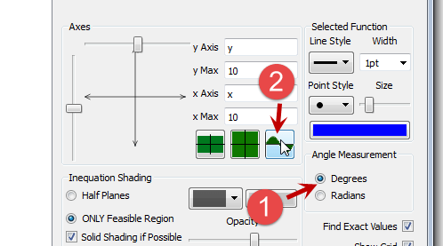This seems more logical to us. It also means that you are no longer reliant on “angle cues”. You can now set x Maximum to anything and, by adding the ` you are forcing FX Graph/Draw to use degrees signs and suitable scales.