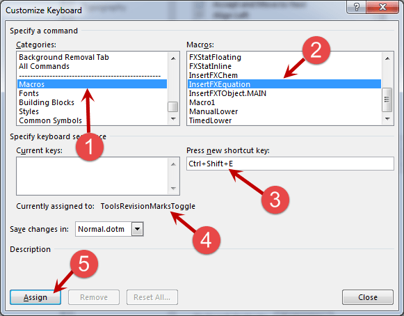 4. Select Macros (1) and then select InsertFXEquation (2). Click in (3) and press a key combination that you would like to use. I have chosen Ctrl+Shift+E. (4) tells you the command that that keyboard shortcut is currently attached to. I don’t use Revision Marks so I am happy using this. Finally, (5) assigns the keyboard shortcut.
