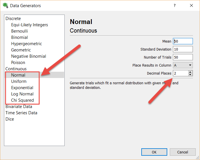 A new decimal places option has been added to the continuous distributions. You can select anywhere from 8 down to -2 decimal places (-2 rounds to the nearest 100).