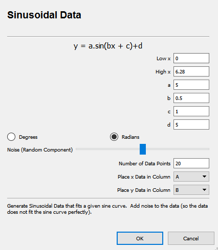 Simply enter the parameters you wish FX Stat/FX Draw to use for the sine curve, select an amount of “noise” to add to the data and push OK.