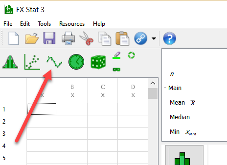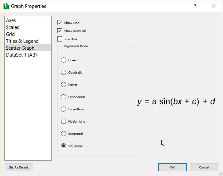 At the moment, FX Stat is trying to fit a linear regression equation to the data (not very successfully!) By right clicking on the graph, we can change the regression equation in use.