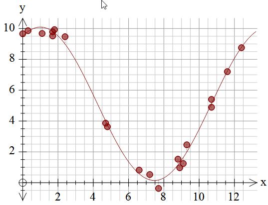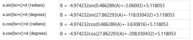 Please note that the calculation of sinusoidal regression equations is not as simple as other regression equations and there are always a number of possible solutions. FX Stat/FX Draw will produce an equation with the longest possible cycle-length (you could, for example, produce a sine curve with a far shorter period than the one shown above that actually “fits” the data better) and the results are similar to those produced using other tools like graphics calculators. There are some cases however, particularly if you have multiple cycles worth of data, where FX Stat/FX Draw may find a solution you were not expecting.