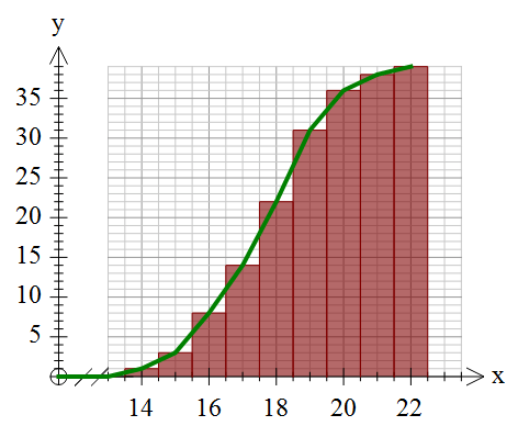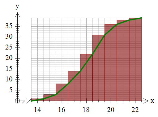 The real problem comes with ogives. If you are thinking of this data as “discrete”, the ogive should look like this (we have put in the histogram so you can see what we mean.)
