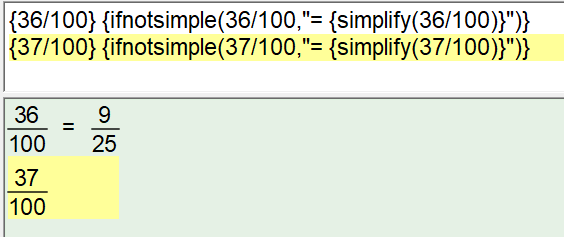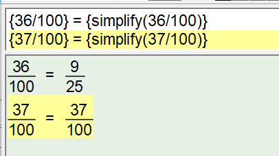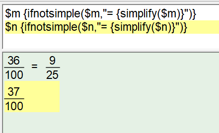 This did, however, create a difficulty! If the solution ended up being 36/100 we want to show the simplified 9/25. If the solution ended up being 37/100 we cannot simplify and would prefer to not show a redundant simplification.